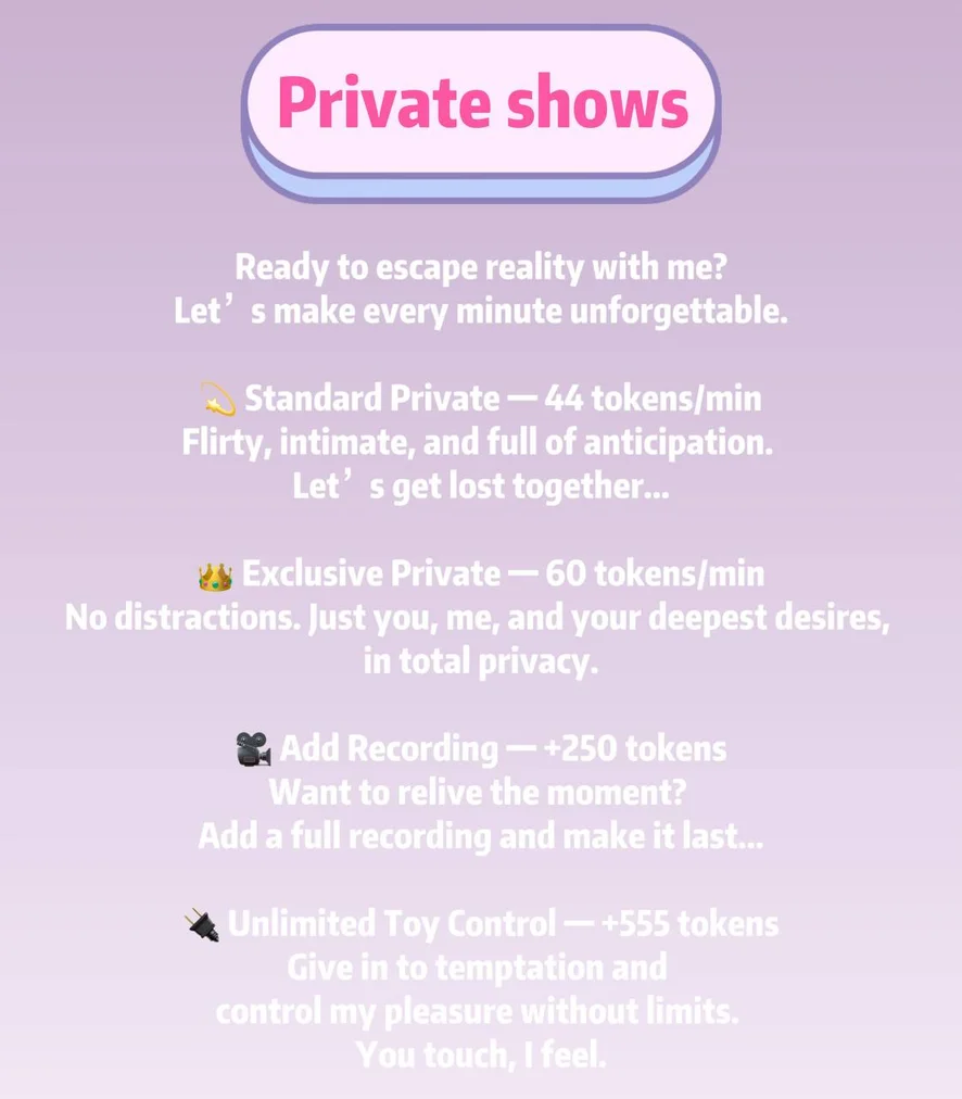 Ahegao, Deve Toynağı, Teşhircilik, Yoga, Yemek Pişirme, Etek Altı, Doggy Stili, Yarrak Puanı, Üstsüz, Ayak Fetişi, Şaplak, Yağlı Şov, Erotik Dans, Konuşmalı, Meme Ucu Oyuncakları, Oral seks, Seks Oyuncakları, Striptiz, Göğüs Sikme, Dildo veya Vibratör, Orgazm, Düz Kovboy, Rol Oyunu, Mastürbasyon, Parmaklama, Elle Muamele